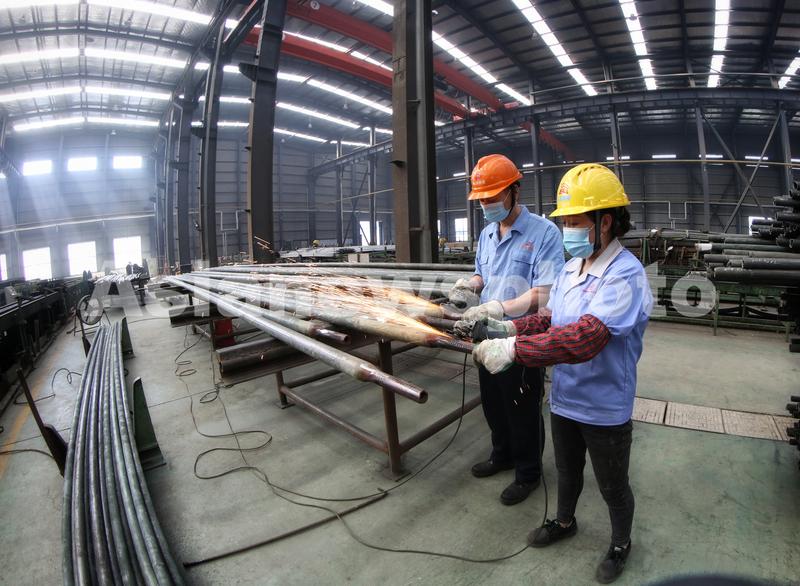 2022年5月13日,江苏省张家港市弘强制管有限公司生产车间里,工人在赶制一批外贸订单。该公司严格落实疫情防控措施,开足马力开展钢管订单生产,满足国内外市场需求。按照“疫情要防住、经济要稳住、发展要安全”要求,张家港市近期出台了28条恵企政策,全力支持市场主体发展,助力企业纾困解难。