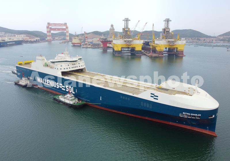 2022年5月16日,双燃料冰级滚装船“BOTNIA ENABLER”轮驶离中集来福士山东烟台建造基地。