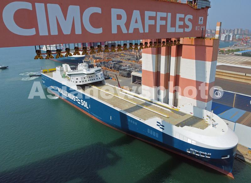 2022年5月16日,在中集来福士山东烟台建造基地,双燃料冰级滚装船“BOTNIA ENABLER”轮整装待发。