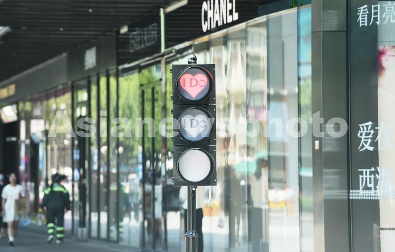 2022年5月17日,随着一年一度的“520”网络情人节即将到来,“爱心”红绿灯和“爱心”斑马线同时出现在杭州西湖边上的湖滨步行街上 ,红绿灯变换着的“爱心”图形和斑马线上粉色的爱心图案,吸引了不少市民游客特别是年轻人前来拍照打卡。