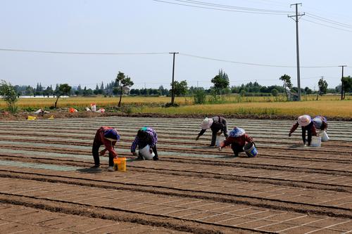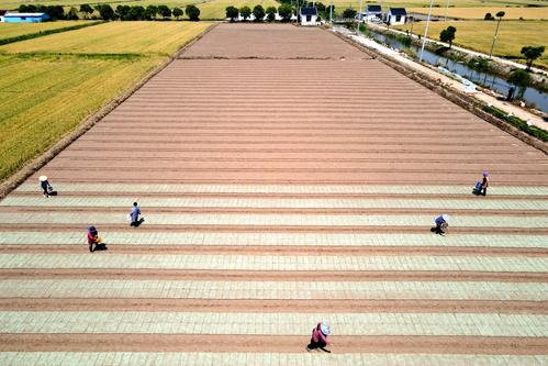 眼下,正值水稻落谷育秧黄金期,江苏省如皋市各地农民抢抓农时,运用电气化、规模化、标准化培育水稻秧苗,为适时插秧和水稻丰产丰收打下基础,田间地头一派农忙景象。