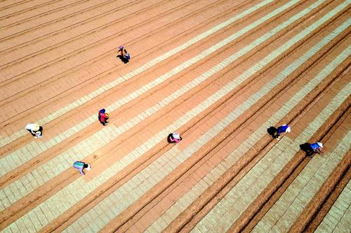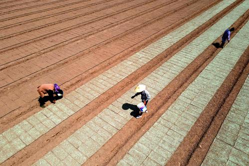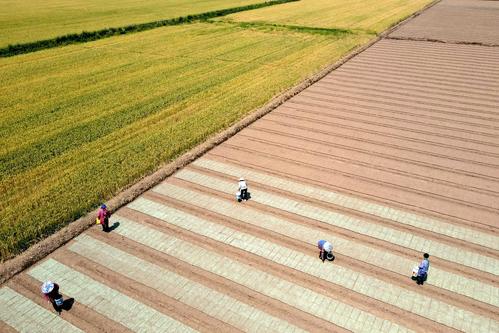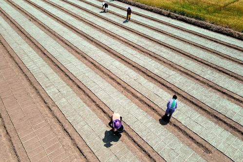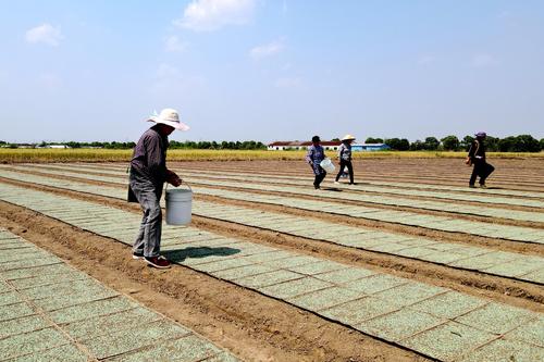2022年5月16日,江苏省如皋市长江镇永建社区“万顷良田项目区”优质水稻种植基地,农民在秧盘上撒播稻种。