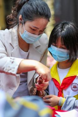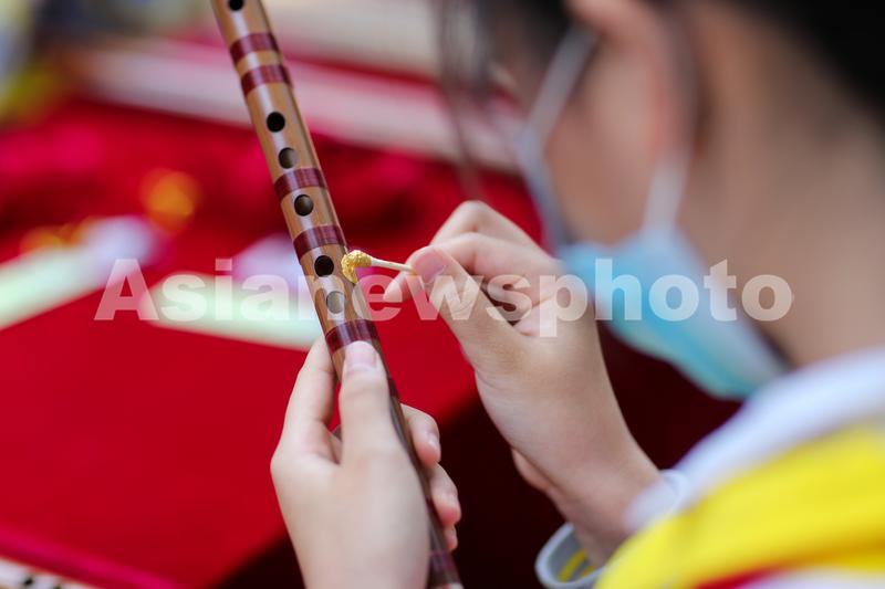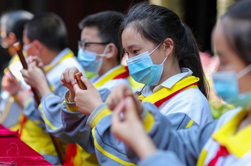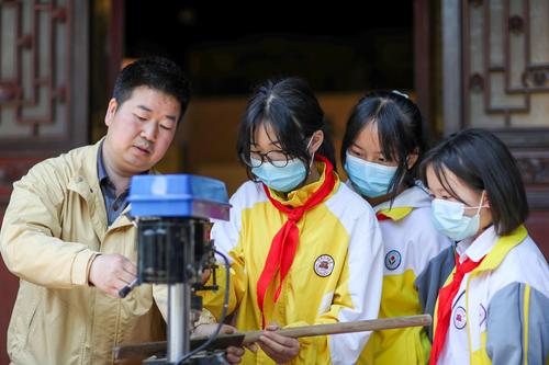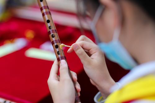 图片说明:2022年5月16日,学生在贵州省铜仁市玉屏侗族自治县箫笛博物馆体验箫笛制作技艺。