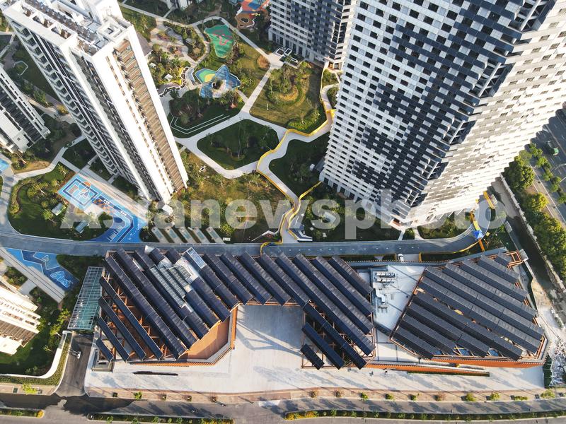 2022年5月17日拍摄的南京江北新区人才公寓一栋能发电的“木屋”。这栋“木屋”是江北新区人才公寓(1号地块)项目社区服务中心,屋面上结合屋顶木屋架布置太阳能板,采用“木结构+光伏发电系统”,实现整栋建筑零能耗及零碳排放,是中国第一栋装配式木结构零碳建筑。