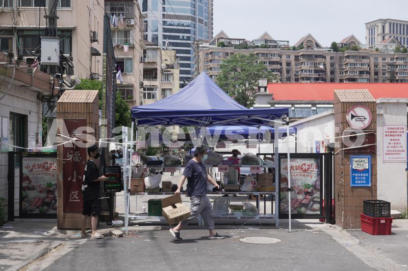 5月18日,上海市幸福路上的幸福小区,被快递架封堵的小区大门