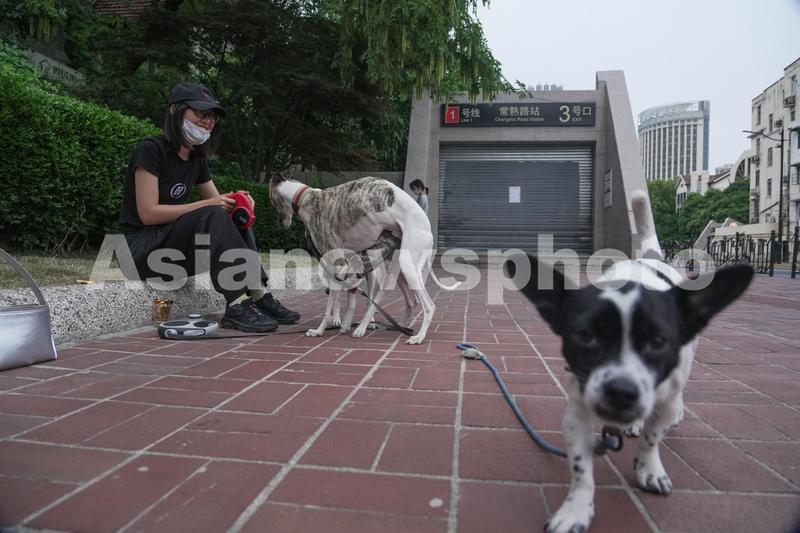 5月18日,上海市淮海中路,已停止运营48天的地铁一号线常熟路站外的遛狗市民。