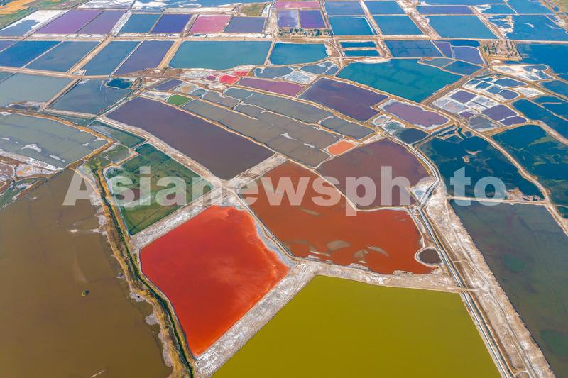 初夏时节,随着气温的升高,山西省运城市盐湖湿地呈现出五彩斑斓的美丽景观。