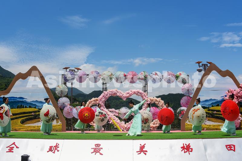图片说明:2022年5月19日,江西省遂川县黄坑乡文艺队队员在表演舞蹈《醉美油纸伞》。