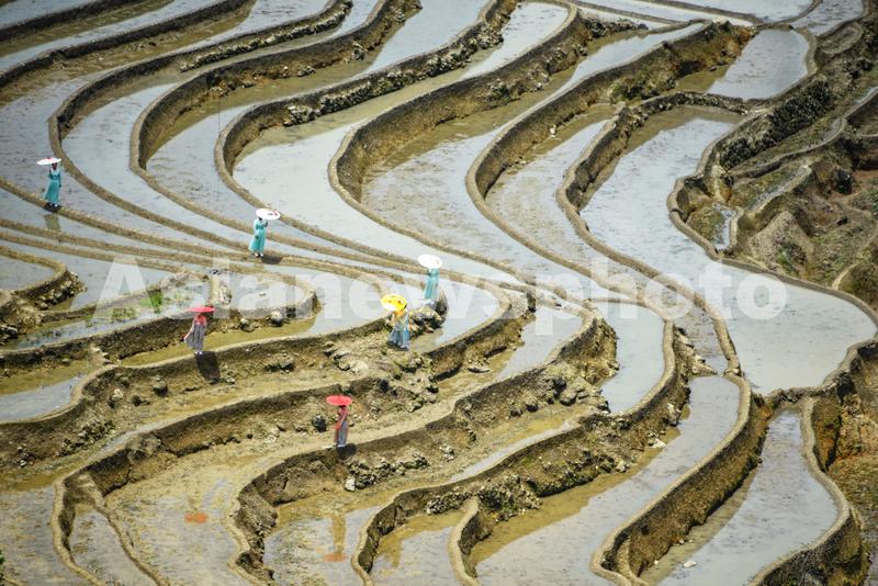 图片说明:2022年5月19日,江西省遂川县黄坑乡文艺队队员撑着油纸伞,行走在梯田的田埂上,展现油纸伞的魅力。