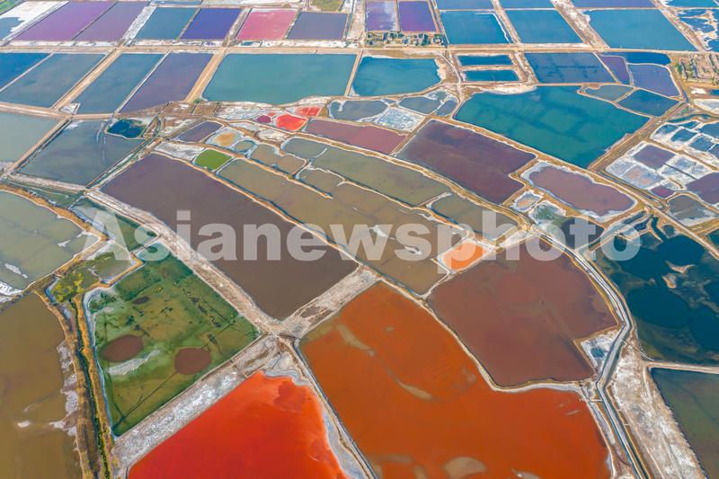 初夏时节,随着气温的升高,山西省运城市盐湖湿地呈现出五彩斑斓的美丽景观。