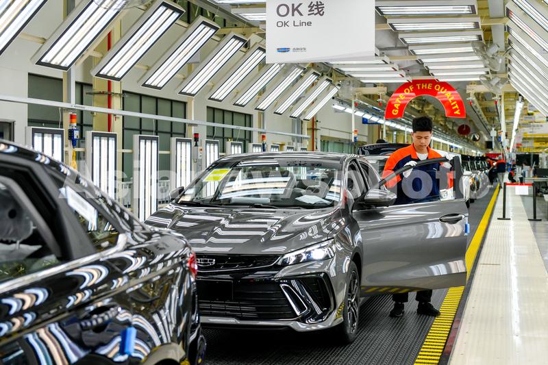 2022年5月20日,吉利汽车浙江湖州长兴基地,技术人员正在对最新款缤瑞 COOL车型Ok线下线前进行整车质量检查。