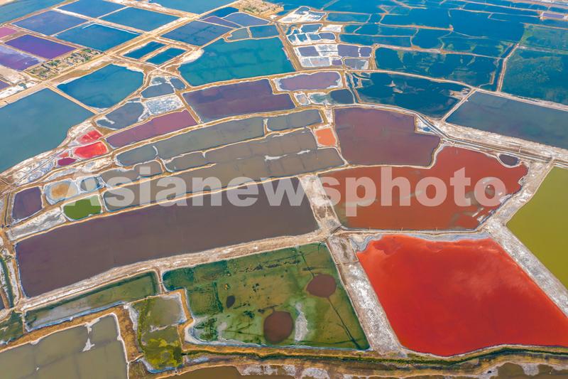 初夏时节,随着气温的升高,山西省运城市盐湖湿地呈现出五彩斑斓的美丽景观。