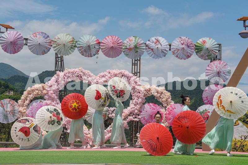 图片说明:2022年5月19日,江西省遂川县黄坑乡文艺队队员在表演舞蹈《醉美油纸伞》。
