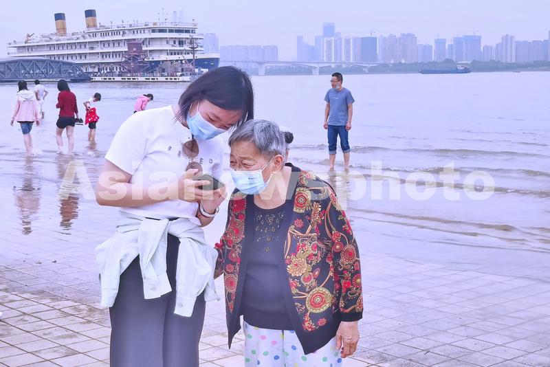 图片说明:5月21日下午,不少市民在江水上骑行、踩水亲近江水。