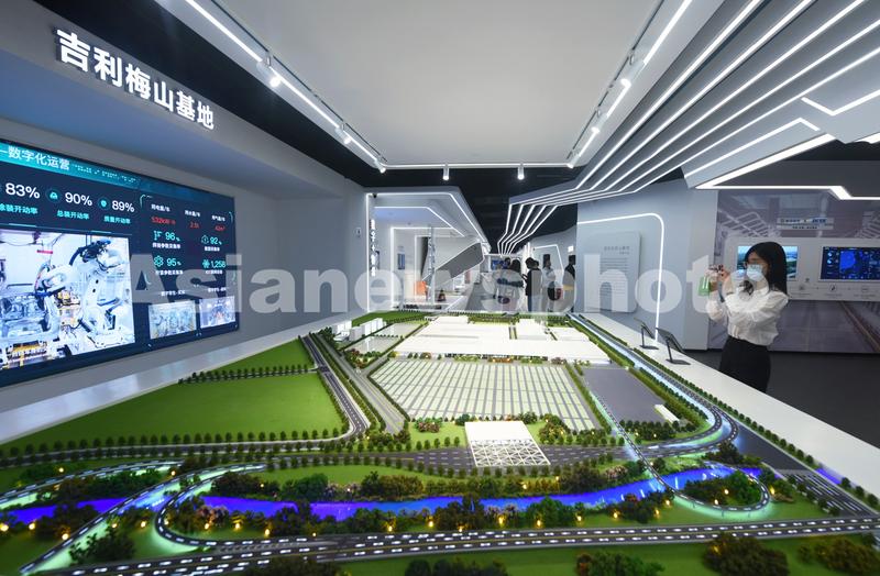 图片说明:2022年5月23日,市民在位于杭州市萧山区的长三角(杭州)制造业数字化能力中心了解吉利的未来工厂。