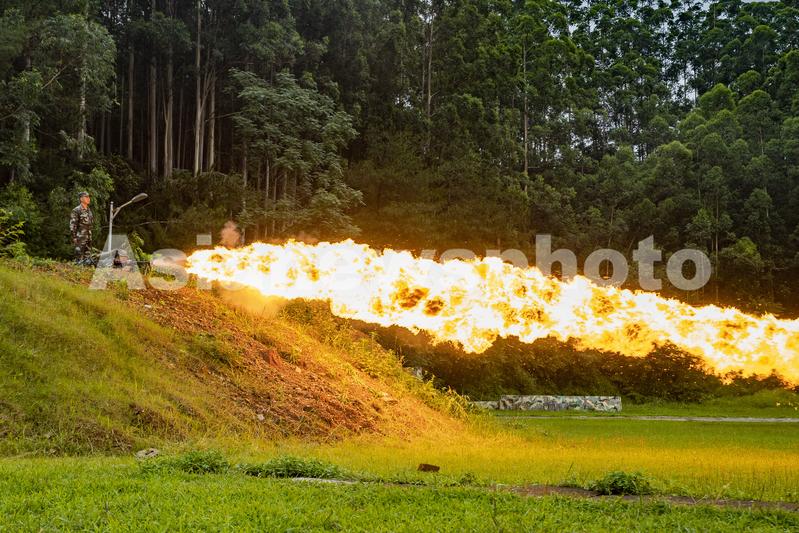 2022年5月25日,防化分队官兵在进行俯角喷火训练。