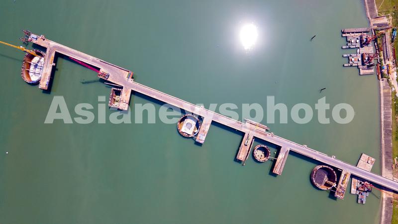 2022年5月25日,航拍浙江省金华市兰江水域上,由中铁三局承建的金建高铁兰江特大桥正在浇筑水中承台,标志着兰江特大桥主桥转入水面以上施工阶段(无人机照片)。