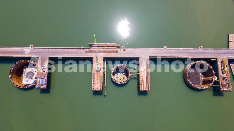 2022年5月25日,航拍浙江省金华市兰江水域上,由中铁三局承建的金建高铁兰江特大桥正在浇筑水中承台,标志着兰江特大桥主桥转入水面以上施工阶段(无人机照片)。
