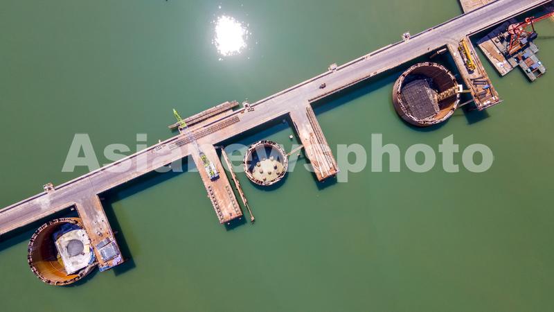 2022年5月25日,航拍浙江省金华市兰江水域上,由中铁三局承建的金建高铁兰江特大桥正在浇筑水中承台,标志着兰江特大桥主桥转入水面以上施工阶段(无人机照片)。