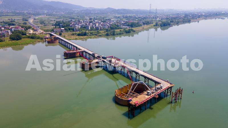 2022年5月25日,航拍浙江省金华市兰江水域上,由中铁三局承建的金建高铁兰江特大桥正在浇筑水中承台,标志着兰江特大桥主桥转入水面以上施工阶段(无人机照片)。