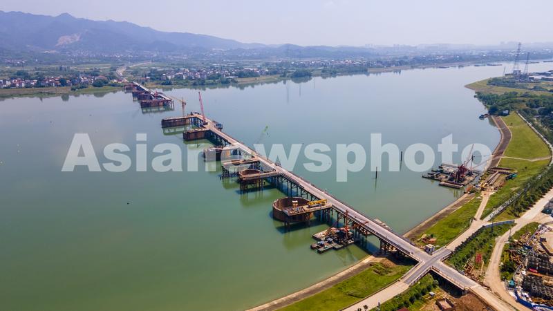 2022年5月25日,航拍浙江省金华市兰江水域上,由中铁三局承建的金建高铁兰江特大桥正在浇筑水中承台,标志着兰江特大桥主桥转入水面以上施工阶段(无人机照片)。