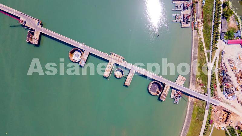2022年5月25日,航拍浙江省金华市兰江水域上,由中铁三局承建的金建高铁兰江特大桥正在浇筑水中承台,标志着兰江特大桥主桥转入水面以上施工阶段(无人机照片)。