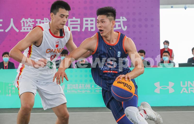 2022年5月26日,在浙江省湖州市德清地理信息小镇三人篮球场,三人篮球邀请赛的参赛队伍选手在比赛中。