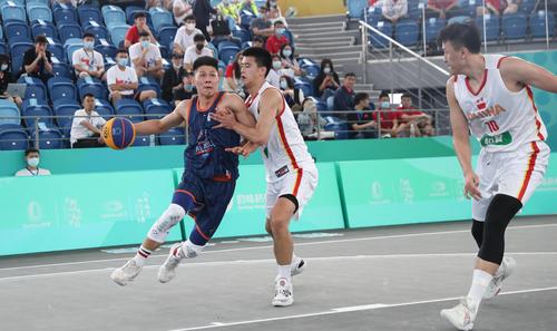 2022年5月26日,在浙江省湖州市德清地理信息小镇三人篮球场,三人篮球邀请赛的参赛队伍选手在比赛中。
