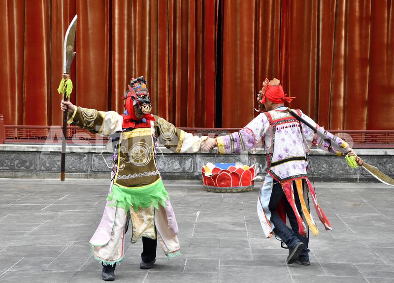 图片说明:2022年5月24日,民间艺人在贵州省遵义市道真仡佬族苗族自治县“中国傩城”景区表演仡佬族傩戏。
