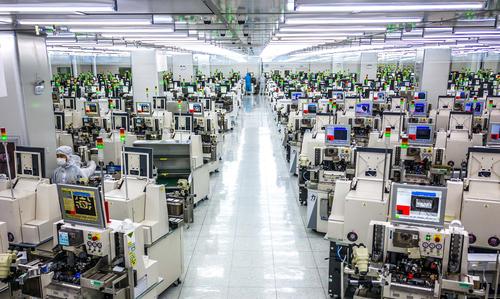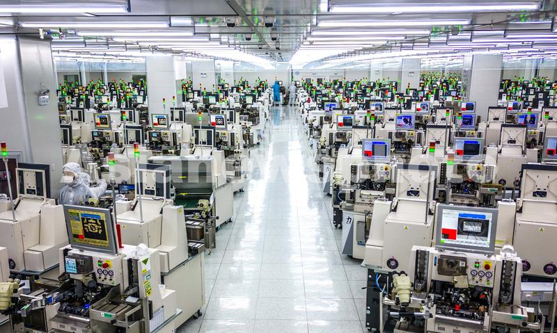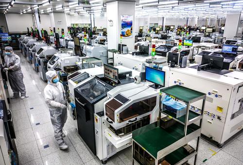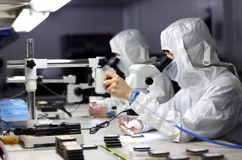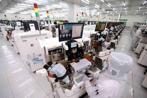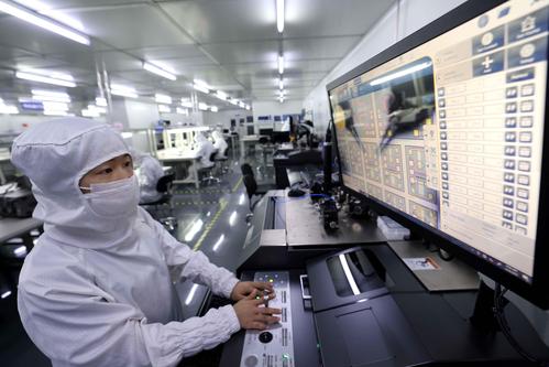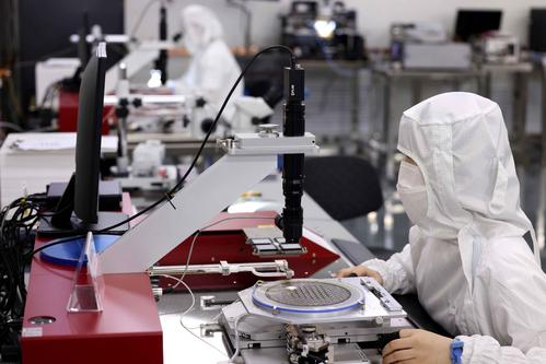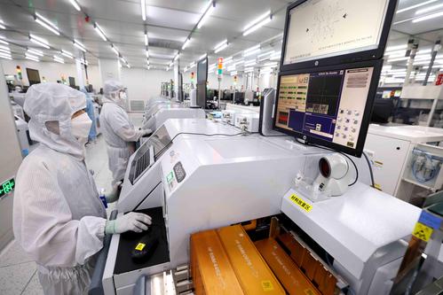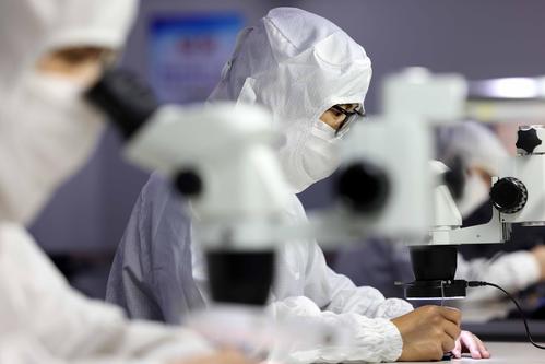 图片说明:2022年5月26日,在安徽省合肥经济技术开发区的合肥通富微电子有限公司,员工在键合生产线上作业。