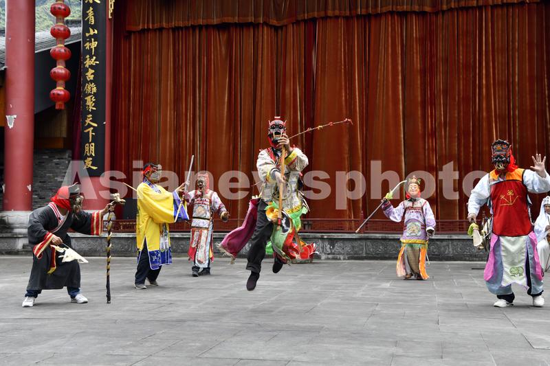 图片说明:2022年5月24日,民间艺人在贵州省遵义市道真仡佬族苗族自治县“中国傩城”景区表演仡佬族傩戏。