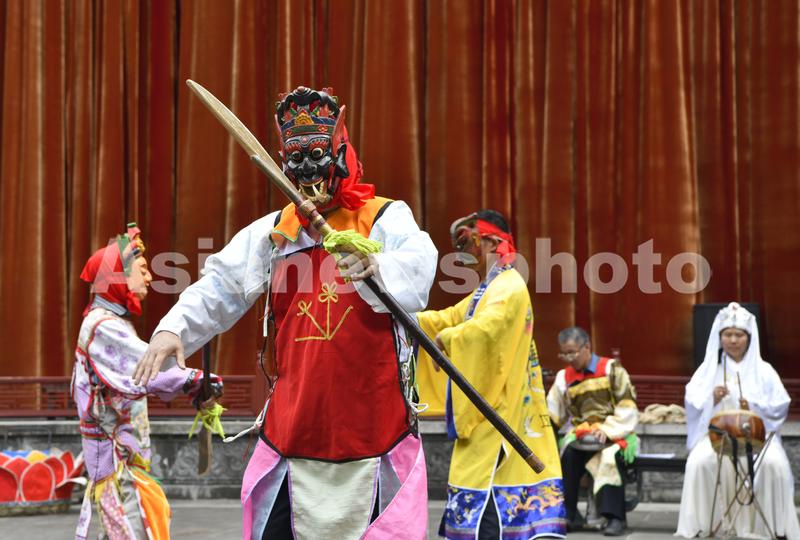 图片说明:2022年5月24日,民间艺人在贵州省遵义市道真仡佬族苗族自治县“中国傩城”景区表演仡佬族傩戏。