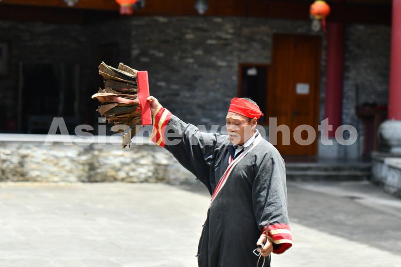 图片说明:2022年5月24日,民间艺人在贵州省遵义市道真仡佬族苗族自治县“中国傩城”景区表演仡佬族傩戏。