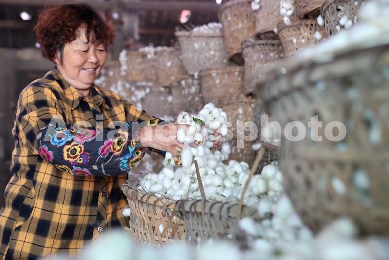 2022年5月27日,浙江省湖州市德清县新安镇下舍蚕茧收购点的工人在整理刚刚收购的春蚕茧。