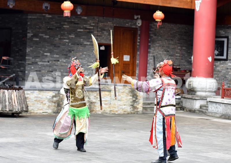 图片说明:2022年5月24日,民间艺人在贵州省遵义市道真仡佬族苗族自治县“中国傩城”景区表演仡佬族傩戏。