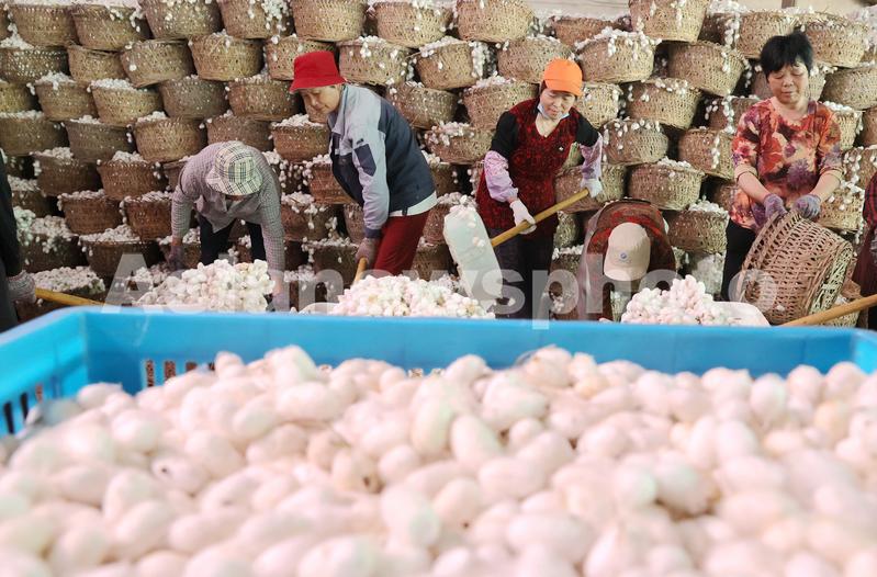 图片说明:2022年5月27日,浙江省湖州市德清县新安镇下舍蚕茧收购点的工人在整理刚刚收购的春蚕茧。