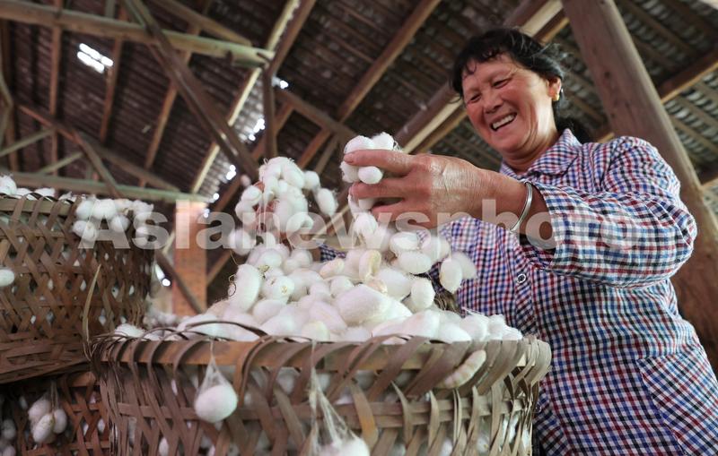 图片说明:2022年5月27日,浙江省湖州市德清县新安镇下舍蚕茧收购点的工人在整理刚刚收购的春蚕茧。