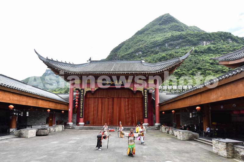 图片说明:2022年5月24日,民间艺人在贵州省遵义市道真仡佬族苗族自治县“中国傩城”景区表演仡佬族傩戏。
