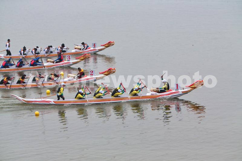 图片说明:2022年5月27日,湖北秭归,湖北省第十六届运动会群众体育龙舟比赛混合组10人奥运龙舟200米直道赛比赛中。