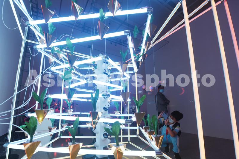 图片说明:2022年6月1日,小观众在浙江美术馆观看中国美术学院2022年毕业展上的多媒体艺术装置《快速生产、快速收获》。