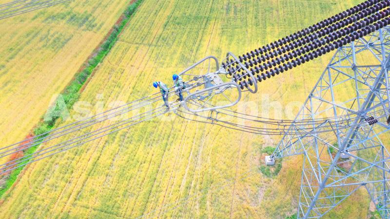 图片说明:2022年5月31日,在安徽省明光市潘村镇,电力工人在120米高空对±800千伏雁门关—淮安特高压直流输电线路进行年度综合检修工作,保障晋电“下江南”畅通输送。