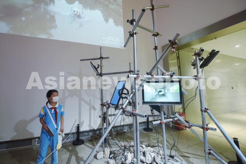 图片说明:2022年6月1日,小观众在浙江美术馆观看中国美术学院2022年毕业展上的多媒体艺术装置《酩酊的、痉挛的》。