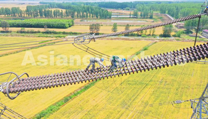 图片说明:2022年5月31日,在安徽省明光市潘村镇,电力工人在120米高空对±800千伏雁门关—淮安特高压直流输电线路进行年度综合检修工作,保障晋电“下江南”畅通输送。