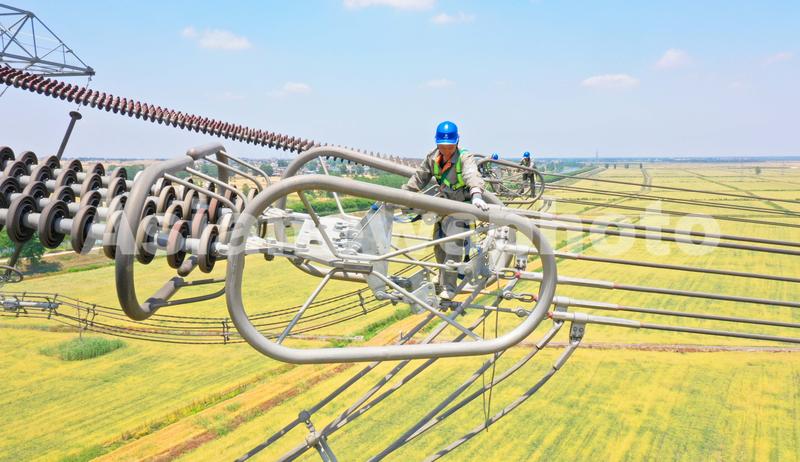 图片说明:2022年5月31日,在安徽省明光市潘村镇,电力工人在120米高空对±800千伏雁门关—淮安特高压直流输电线路进行年度综合检修工作,保障晋电“下江南”畅通输送。
