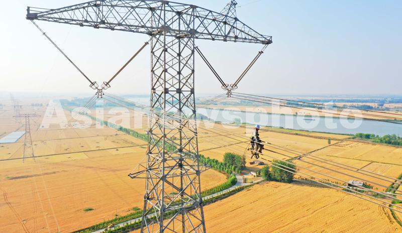 图片说明:2022年5月31日,在安徽省明光市潘村镇,电力工人在120米高空对±800千伏雁门关—淮安特高压直流输电线路进行年度综合检修工作,保障晋电“下江南”畅通输送。