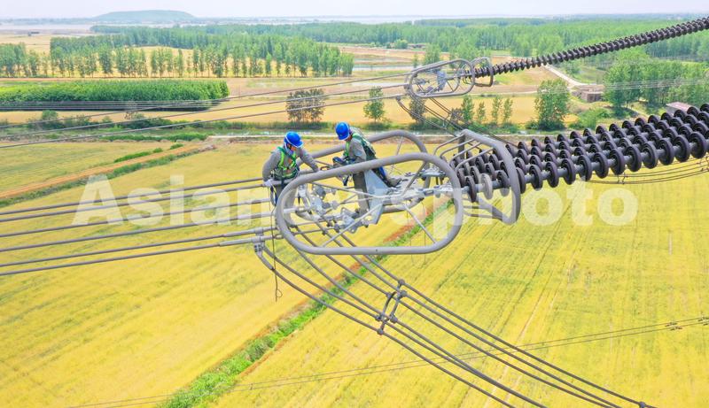 图片说明:2022年5月31日,在安徽省明光市潘村镇,电力工人在120米高空对±800千伏雁门关—淮安特高压直流输电线路进行年度综合检修工作,保障晋电“下江南”畅通输送。