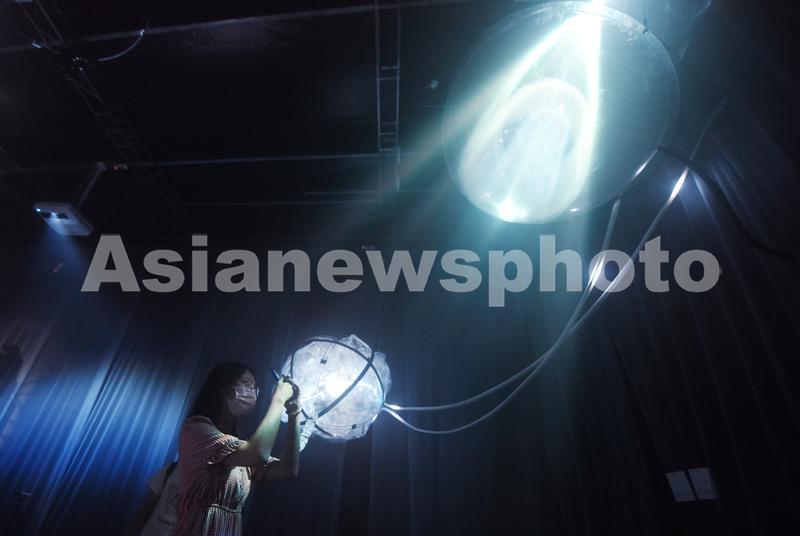 图片说明:2022年6月1日,观众在浙江美术馆观看中国美术学院2022年毕业展上的多媒体艺术装置《未来之眼》。