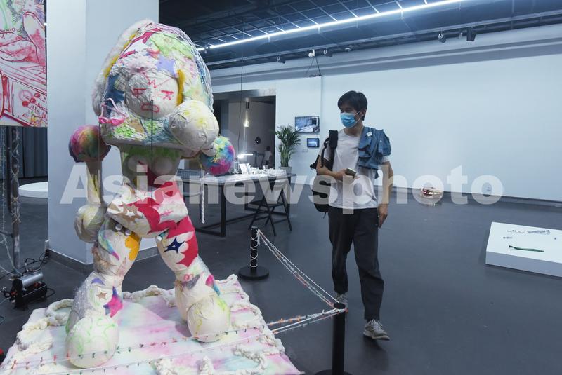 图片说明:2022年6月1日,观众在浙江美术馆观看中国美术学院2022年毕业展上的艺术装置《宅女》。