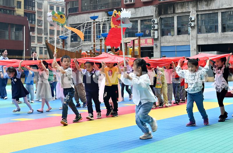 图片说明:2022年 6月2日,湖南省邵阳市洞口县文昌街道智雅星幼儿园,小朋友们在开展旱地赛龙舟比赛。