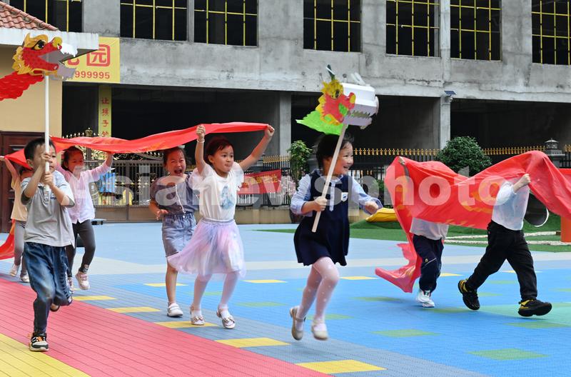 图片说明:2022年 6月2日,湖南省邵阳市洞口县文昌街道智雅星幼儿园,小朋友们在开展旱地赛龙舟比赛。